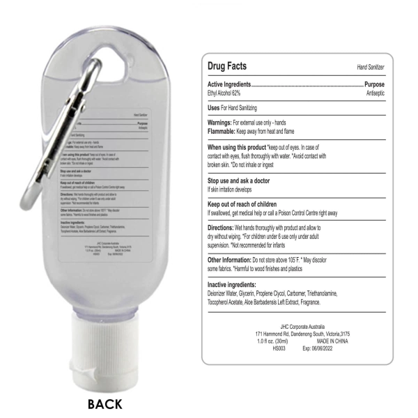 30ml lightly scented clear gel hand sanitizer in a white plastic bottle with an aluminium carabiner squeeze the bottle to apply the gel onto your hands contains 62% alcohol and kills 99.9% of bacteria and germs meets FDA requirements small and handy to carry in a hand bag or on your key chain.