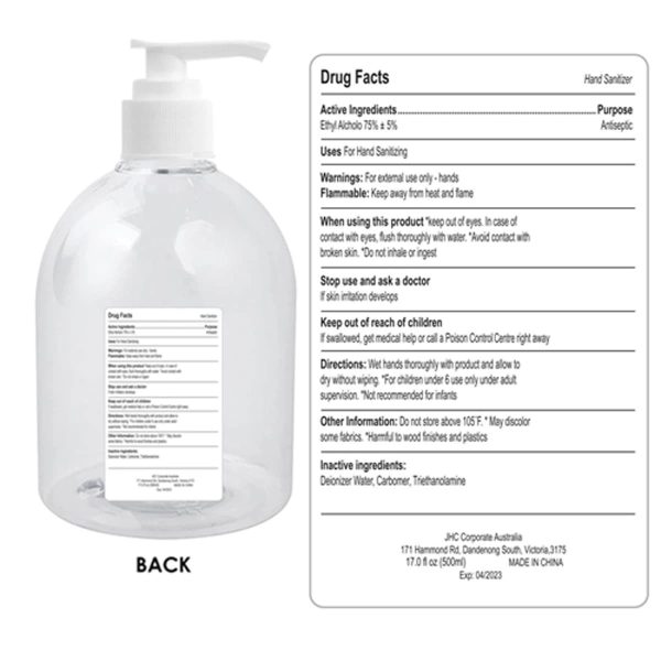 500ml lightly scented clear gel hand sanitizer in a clear plastic bottle press the nozzle to apply the gel onto your hands contains 75% alcohol and antiseptic ingredients which is a substance that is used on the skin to kill microorganisms or prevent the growth of microorganisms kills 99.9% of bacteria and germs meets FDA requirements. It is a large size for office or corporate use.