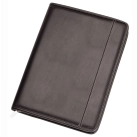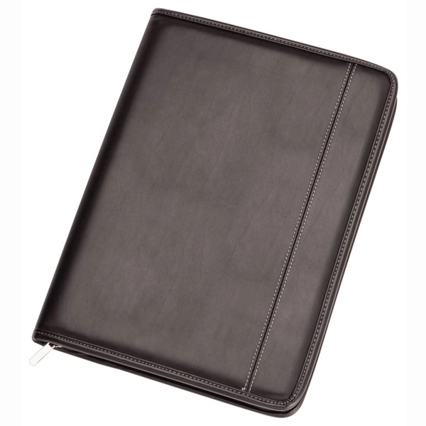 A4 size zippered compendium in koskin leather-look material with white stitching and grey EVA material contrast panels inside.