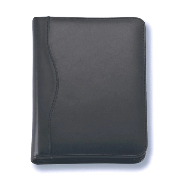 Stylish and durable compendium made from top grade cowhide with zippered closure and removable 6-ring binder.