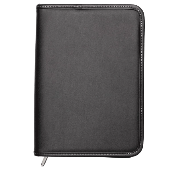 Manufactured from black koskin with white stitching this compendium has a black and white striped polyester interior.