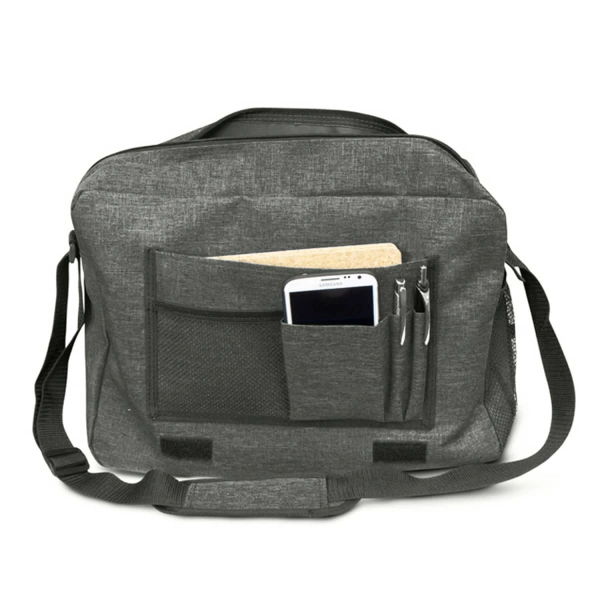 Stylish messenger bag which is manufactured from poly-canvas with an on-trend heather-style finish. It has an adjustable shoulder strap with a shoulder pad and an internal padded laptop compartment. Other features include a multi-functional organiser, an external front pocket and a mesh water bottle holder.