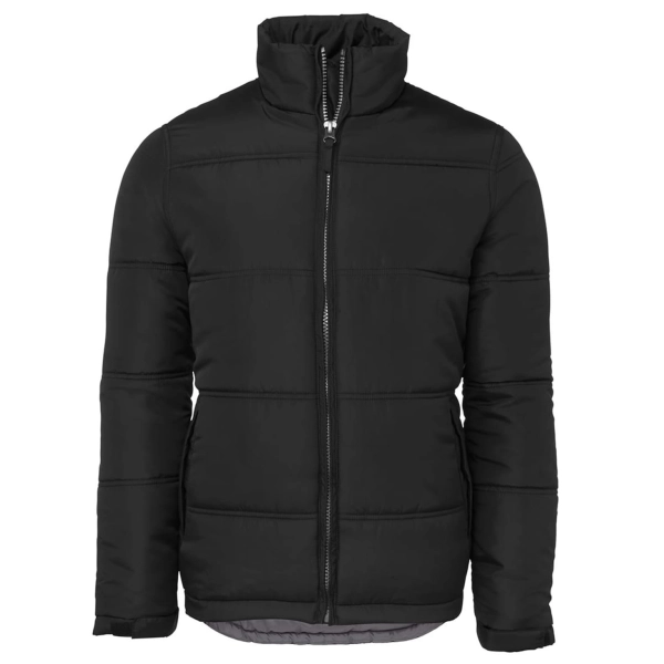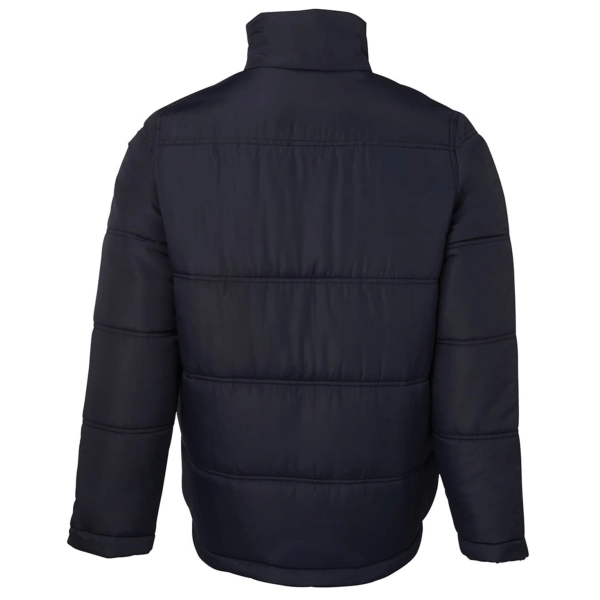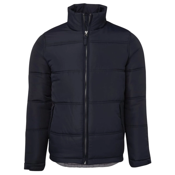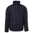 Urban Fit | Polyester pongee shell and contrast polyester lining | Extra thick poly fill with horizontal design lines | Two front pockets with water shedding pocket flaps | Zip-through collar | Chunky front zipper | Back drop tail | Embroidery Zipper
