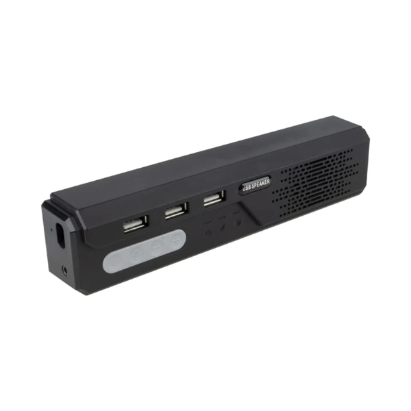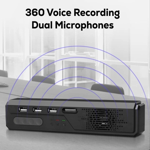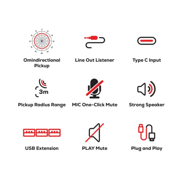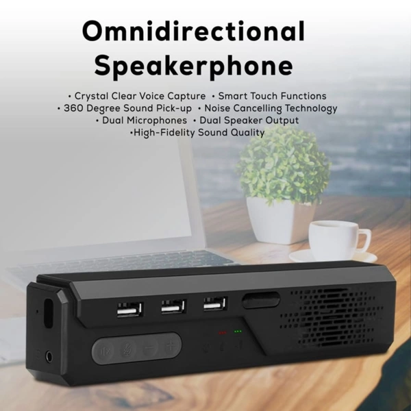 Compact and portable, the Akron omnidirectional speaker phone provides crystal clear voice capture for online conference calls. Features include 360-degree sound pick-up, Noise Cancelling Technology, built-in dual microphones, dual speaker output, high-fidelity sound quality, mute switch and headset jack input, and 3 additional USB ports. Includes a 1.8-metre Type-C charge cable and user manual. Material: ABS.
