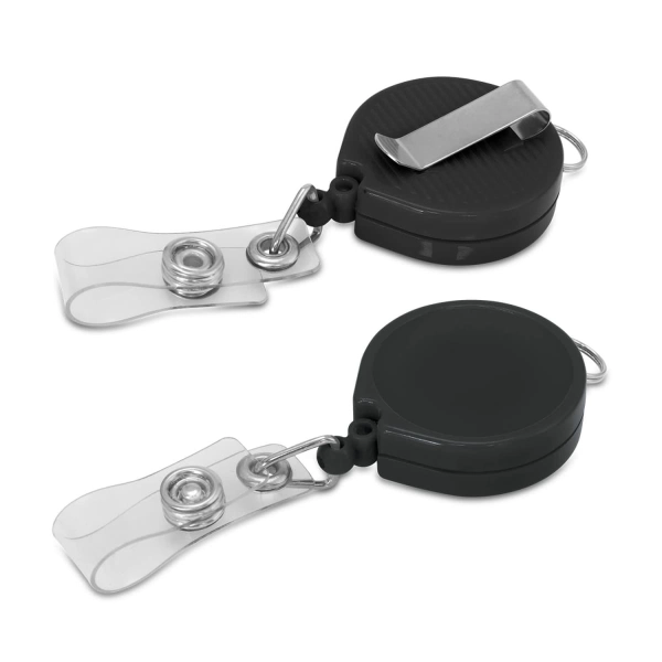 Retractable ID holder with a reliable steel spring and a standard dome attachment for holding plastic ID card holders. It has a pocket clip on the reverse and a split ring on the top for attaching it to a lanyard. Lanyards and clear vinyl ID holders are available on request.