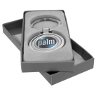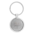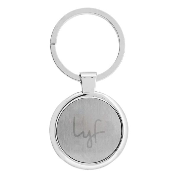 The Anello Keychain features a round, circular matte/frosted metal design with polished chrome metal accents. A sleek and stylish accessory that adds a touch of sophistication to your keys while offering a great opportunity for custom branding.