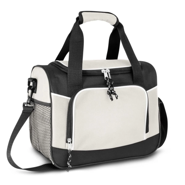 Smart 9L cooler bag with thick PE foam insulation encased in a water-resistant PEVA liner. The outer construction is 600D polyester with a zippered external front pocket and trendy white piping. It has handles with a Velcro cuff and an adjustable shoulder strap which is detachable.