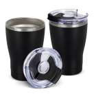 Stylish 350ml double wall, vacuum insulated stainless steel mug with a tough powder coated finish. It has an ergonomic, curved silhouette, features a transparent push on lid with a colour-matched flip closure, and is presented in a natural gift box.