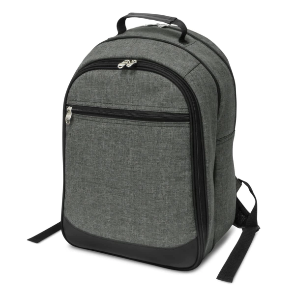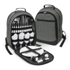 Superb four person picnic backpack which is manufactured from poly-canvas that has an on-trend heather style fabric finish. It has a large zippered cooler compartment at the front which is lined with thick PE foam insulation encased in a water-resistant PEVA inner liner. The rear compartment has a zip around closure that allows it to open out to 90 degrees revealing plates, cutlery, napkins and glasses for four people. There is also a wine waiter's knife and salt and pepper shakers. Other features include an external zippered pocket on the back, a padded front for comfortable carrying, adjustable shoulder straps and a carry handle.