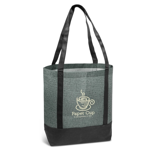 Reusable two-tone tote bag with an on-trend heather style finish. It is manufactured from 80gsm non-woven polypropylene. Armada has externally sewn long carry handles for extra strength and a large base gusset for added carrying capacity.