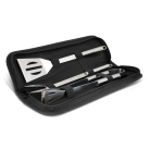 Durable barbeque set in a reinforced 600D polyester case with a large slip pocket on the front and a zippered closure. It includes a fork, a pair of tongs and a spatula, all of which are manufactured from non-stick food grade stainless steel.