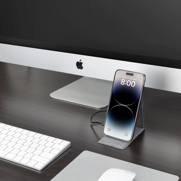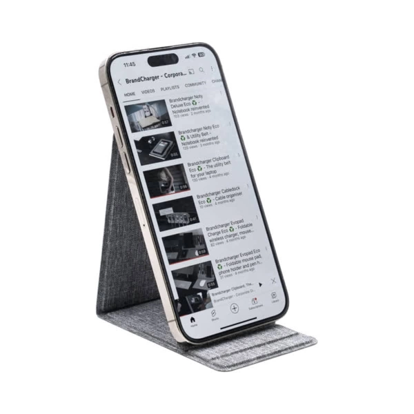 Crafted from recycled PET bottles, the Ascend Charge is a magsafe fast wireless charging phone stand designed to create your perfect workspace anywhere. The unique magnetic fold closure design makes Ascend Charge the most portable and practical charger stand for your phone. This smart gadget should always be in your bag whether at the office, at home or on the go. The package includes a silicone magsafe sticker that enables the non-magnetic smartphone to be charged on this wireless charger with a Type-C charge cable and printed instructions. Material: RPET.