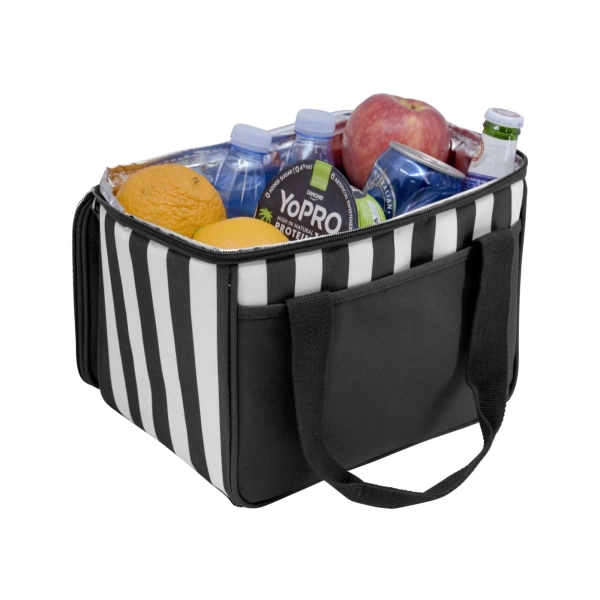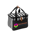 This on-trend cooler is the perfect addition to your day out at the beach, picnic with friends or BBQ in the park. Made from stylish striped polyester and featuring high quality super-insulating foam combined with ‘A-Grade’ (food safe) waterproof aluminium lining. This cooler also features super-soft cotton handles, leather look zip pullers & mini handle wrap as well as a handy outer slip pocket.