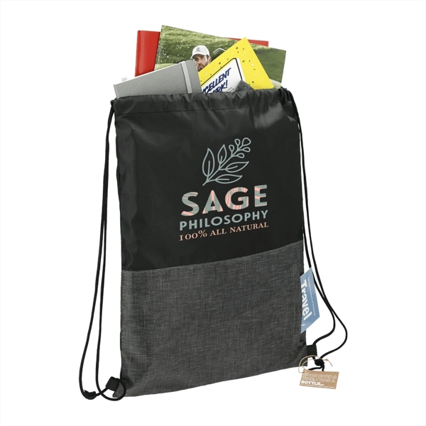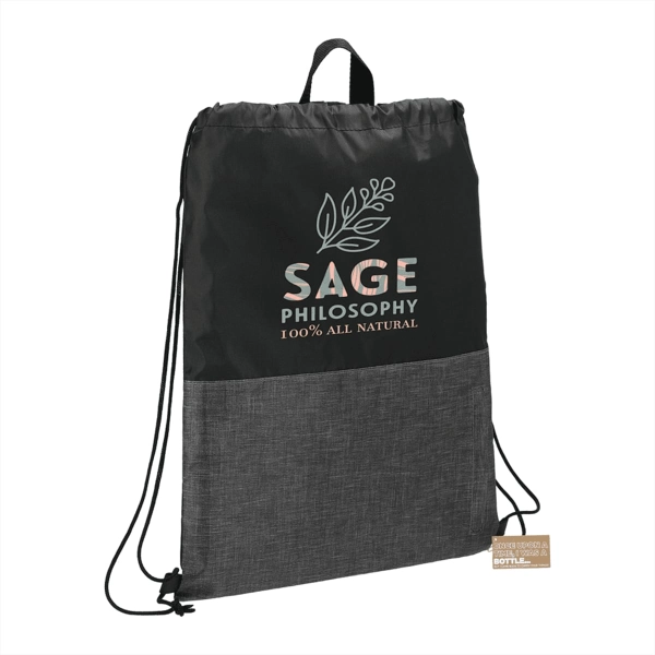 The Ash zippered recycled drawstring bag features a cinch closure with a vertical zippered front pocket.