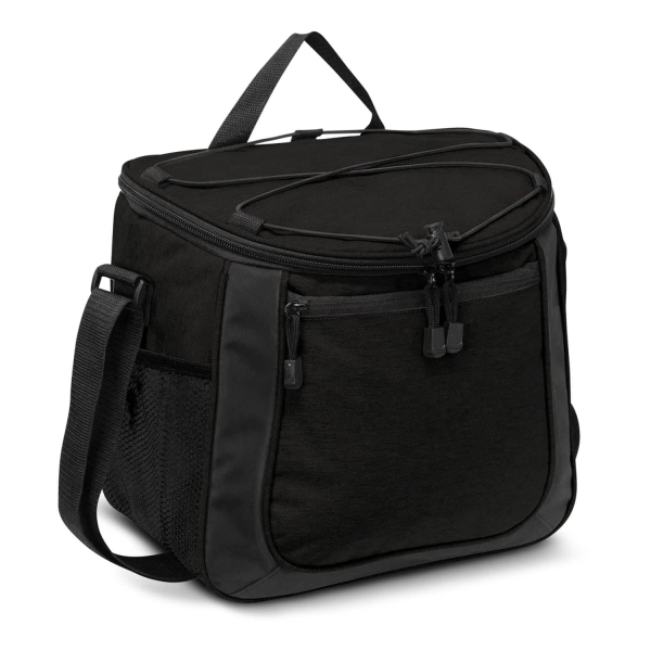 Impressive 13L cooler bag with thick PE foam insulation encased in a water-resistant PEVA inner liner. The outer construction is 600D polyester with a large zippered front pocket and two mesh side pockets. Other features include a zippered top closure, smart zipper pulls, a woven carry handle and trendy elastic lacing which is ideal for holding a sweater or light jacket.