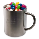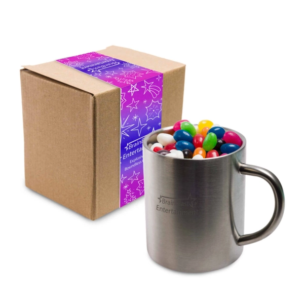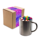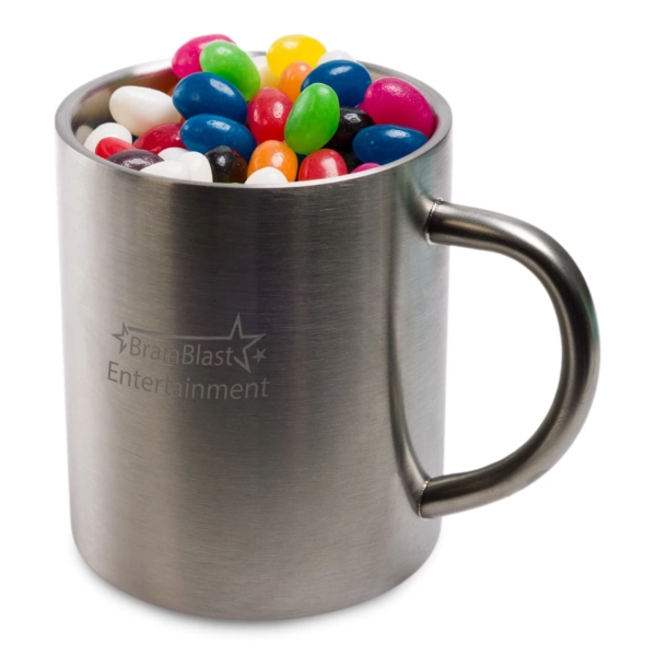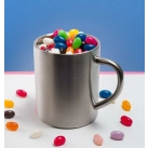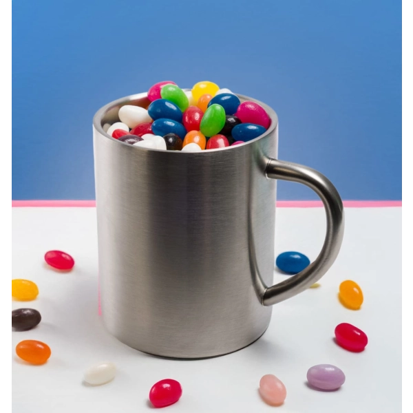 280 grams of assorted mini jelly beans shrink wrapped in stainless steel double wall barrel mug. Mix of 9 great colours and flavours - White (Lychee), Yellow (Lemon), Orange (Orange), Red (Strawberry), Purple (Grape), Pink (Raspberry), Green (Apple), Blue (Blueberry), Black (Aniseed).