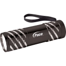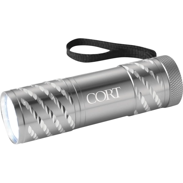 9 white LED lights. Push button to turn power on/off. Wrist strap. Engraves white, Titanium item engraves tone-on-tone.