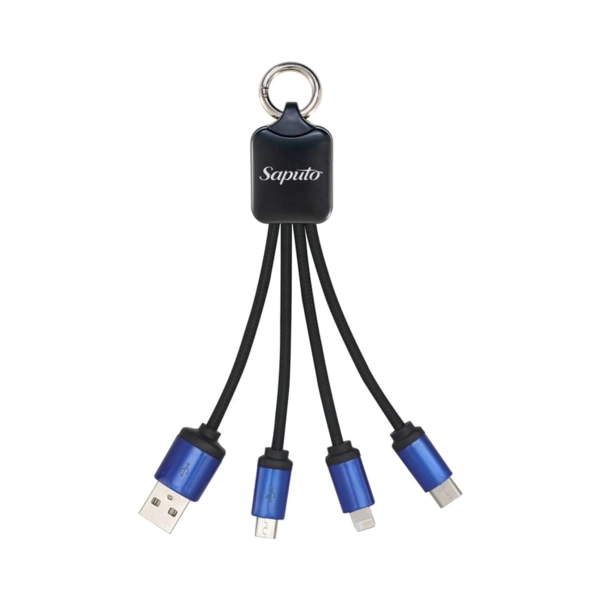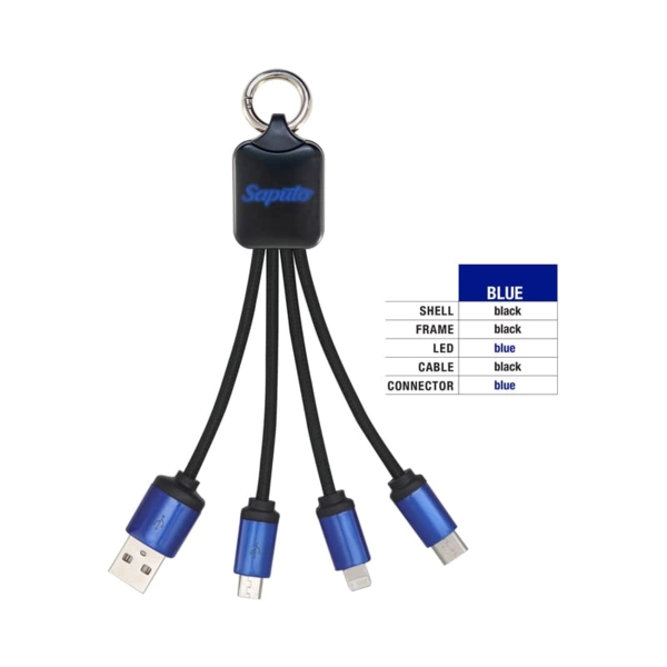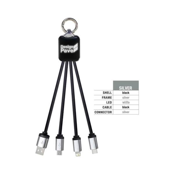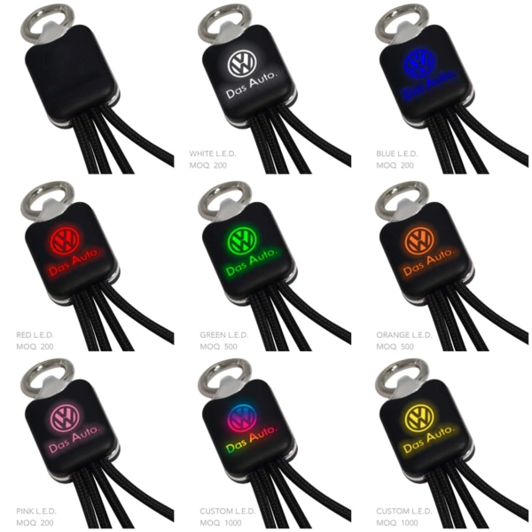 The Atesso charge cable, with double-sided light up branding and 5 standard colour configurations, will bring your logo to life! What makes this product unique is its anti-tangle cable manufactured from high quality 24 AWG copper, plated heads, contrasting connectors and keyring attachment. In addition, the Atesso cable can be packaged in a press lock pouch or slide gift box that can be fully customised to further enhance your brand. Suitable for all mobile devices by providing USB to Micro USB, 6 Pin (lightning) and Type-C connections. Please note we can add NFC chips to these cables to connect with online data. Material: ABS, Nylon Fabric.