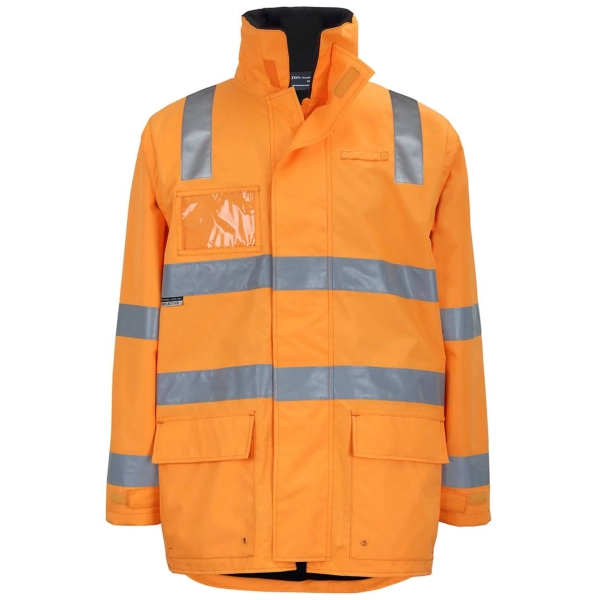 Classic fit | 300D Polyester oxford shell fabric with PU coating, waterproof rating to 20,000mm | 290gsm polar fleece body lining | 190T taffeta sleeve lining | Aust. Rail Orange with silver reflective tape | JB's reflective tape stands up to 50 times domestic wash | Two hoop tape on body and two rows on sleeve | Long line style, fully seam sealed | Detachable sleeve | Concealed hood inside collar | Wind flap with hook pile closure | ID patch pocket at right hand chest, tab on left hand chest | Complies with AS/NZS 1906.4:2010 and AS/NZS 4602.1:2011 Day and Night | Complies with AS 7471:2019 Australian Rail PPE minimum requirements | Complies with Standard AS 4399:2020 for UPF Protection (UPF 50+)