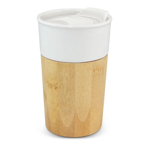 Stylish 450ml, ceramic coffee cup with a trendy bamboo outer wall that provides additional insulation and ensures the cup is a comfortable temperature to hold. Bambino features a push on lid with a sliding closure. It is BPA-free and is presented in a black gift box. Bamboo is a natural material which produces unavoidable variances in the grain pattern, colour and branding. This product is not dishwasher safe and handwashing is recommended.