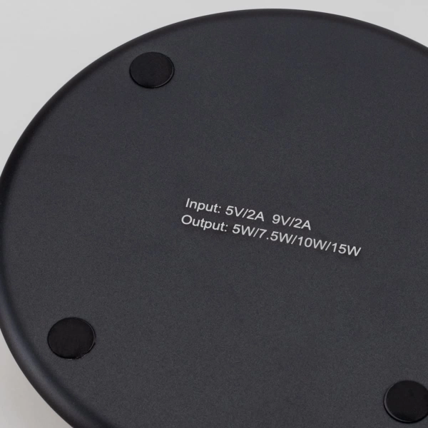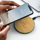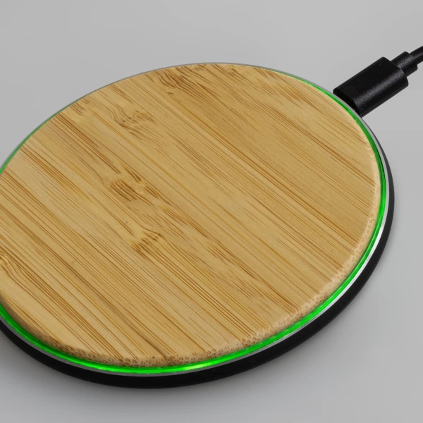 Handy 15W wireless charger with fast charging capability. The charger features a natural bamboo charging pad and an aluminium base. An outer ring illuminates to indicate charging status. For convenient wireless charging, simply plug it into any USB port or mains adapter and place a compatible device on the bamboo charging pad. The charger will work with most modern devices and is presented in a printed black gift box with instructions.