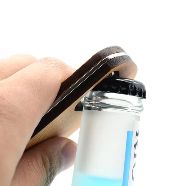 Natural bamboo modern designed bottle opener keyring with stainless steel middle inner plating. Packed into a black cardboard gift box.