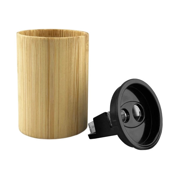Bamboo pencil sharpener with specially designed black plastic lift off lid that enables clean disposal of pencil shavings. Suitable for skinny and large standard pencils.