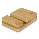 Minimalist phone stand that is manufactured from natural bamboo and will display a smartphone horizontally or vertically. Bamboo is a natural material and because the plant is fast growing, it places less demands on natural resources and produces a material that is durable and versatile. Bamboo can also produce unavoidable variances in the grain pattern, colour and branding.