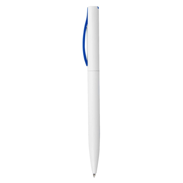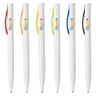 Solid white plastic barrel with coloured slim curved clip twist action with a high quality German manufactured black ink refill 1200 meters writing distance tungsten carbide ball which brings you the better writing quality.