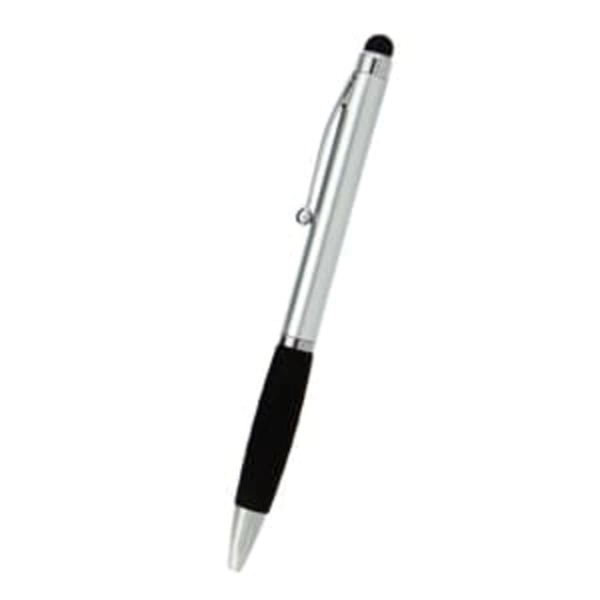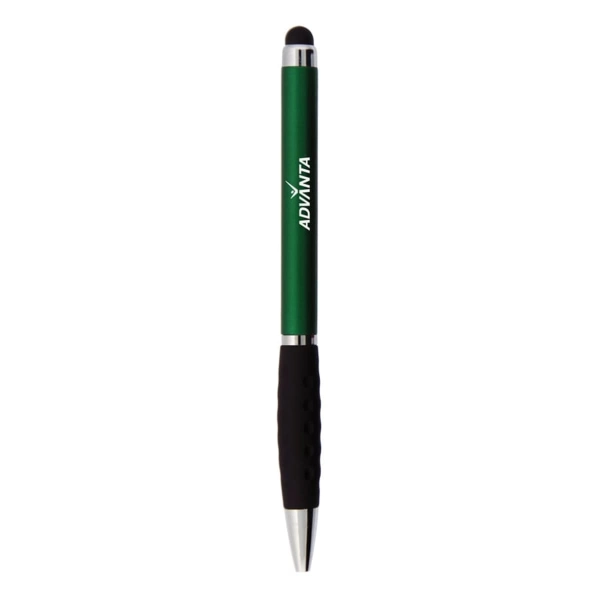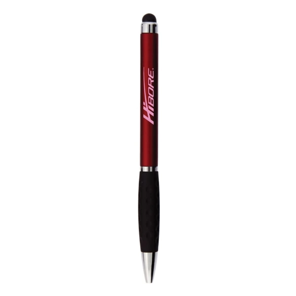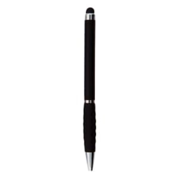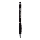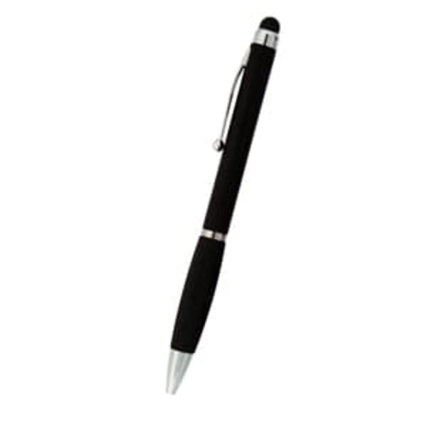 A dual-purpose plastic twist action pen featuring a soft stylus orb. The pen has dimpled ergonomic rubber grip. Stylus ball on the end of clip works great with your mobile device, iPad, tablet, or other tech devices. Enjoy the functionality and convenience this pen will bring. Comes with black ink.