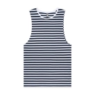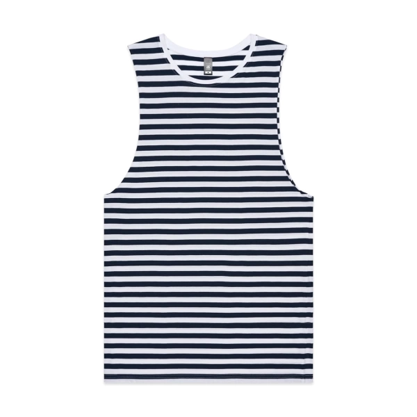 Sleeveless tank, raw armhole edges, varied stripe width across colours, neck ribbing, double needle bottom hem, preshrunk to minimise shrinkage