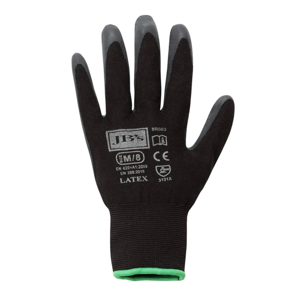 Knitted 13 gauge seamless nylon liner | Latex palm coating in crinkle finish for improved anti slip performance | CAT 2: EN420 and EN388 rating 2131X | General purpose dipped glove | Over locked cuff with band size identifier | Individual hang cell packaging | 10 inner packs per Carton | Suggested Applications: | - Construction | - Masonry | - Landscaping | - Garbage Collection | - Carpentry | - Highway Work | - Floor Tiling | - Shipping and Receiving | - General Purpose | - Roofing