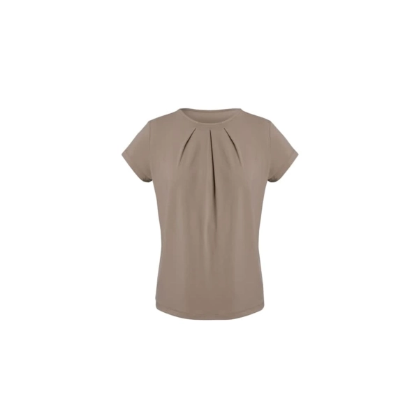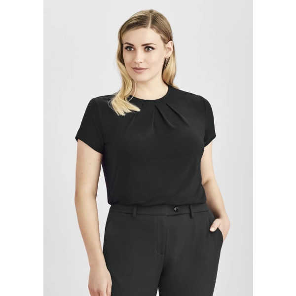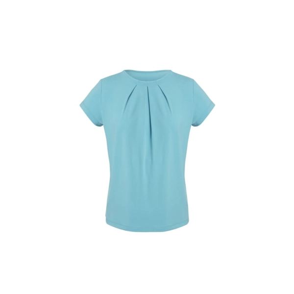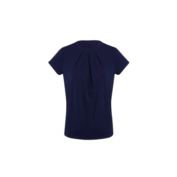 This short-sleeved style has a classic crew neckline with pleat details, it’s designed to be a semi-fitted top. Wear yours tucked in or out.