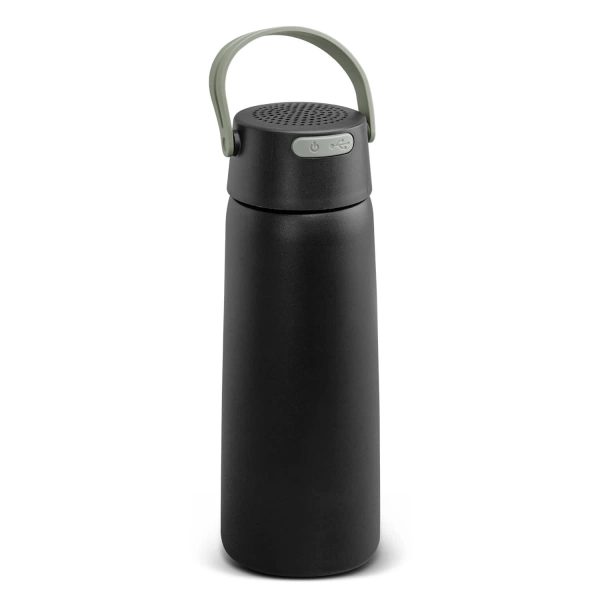 Stylish 700ml double wall, vacuum insulated stainless steel bottle with a powder coated matte finish. It will keep drinks cold for 24 hours or hot for up to 12 hours. The bottle has a secure screw on lid with a soft-touch carry handle and a built-in water-resistant Bluetooth speaker which produces high quality sound. It will play music for approximately two hours and can be recharged from a USB port or a mains adapter. This premium bottle is presented in a black gift box with an instruction leaflet and a Micro-B USB cable. It is BPA-free and laser engraves to a shiny steel finish. This product is not dishwasher safe and handwashing is recommended.