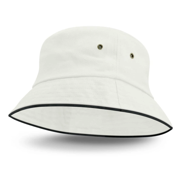 Premium cotton twill bucket hat with black trim and a sweatband. The hat's material provides excellent UPF50 protection from the sun and complies with AS/NZS standards for sun protection. Bondi Bucket Hat is available in three sizes which will fit most people, including kids.