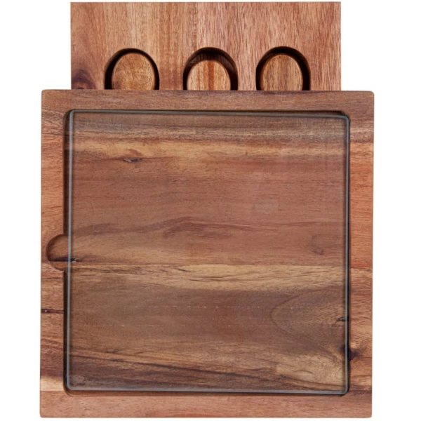 The Braemar Glass Cheese Board & Knife Set features a tempered glass board inset into beautifully crafted acacia wood. A hidden drawer in the base keeps a 3-piece knife set neatly stored. Known for its unique natural contrasting patterns, each piece is one of a kind. Presented in a premium book-style gift package, this set is the perfect addition to any gathering or a thoughtful gift.