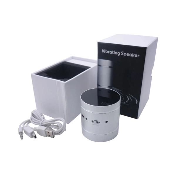 Bluetooth vibration speaker, contrasting aluminium alloy case, power output RSW - 10 watts, Bluetooth operates to a distance of 10 meters, line-in by mini USB allows access to smartphone / PC / notebook. Playback time - 4 hours on (max volume). Charge time - 2-3 hours. Includes a lithium battery, USB charge cable, auxiliary input cable and user manual. Optional suction stand available