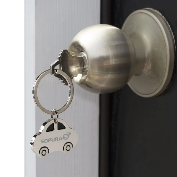 A cute fun car shape keyring has 2 black windows and 2 wheel mark lines rounded bonnet and boot made from zinc alloy with matt finishing it is certain to attract a lot of attention as a promotional give-away product. Ideal for car industry and travel agents.