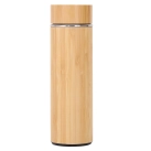 Elegant slim design 450ml stainless steel vacuum double wall drink bottle with filter featuring an eco-friendly sustainably sourced natural bamboo outer wall. It has an option of 3 type of lids: no handle rope handle and steel wire handle. It is leak-proof and can keep hot for at least 4hrs - 8hrs and cold for 24hrs. The inner wall is 304 food grade stainless steel and 100% BPA free. It is not dishwasher and microwave safe handwashing is recommended. Do not place dry ice carbonated drinks etc. The natural bamboo does produce variances in colour grain pattern and branding. This bottle is small enough to carry around they can fit into totes bag packs and most car cup holders it has large capacity suitable for carrying a variety of coffee hot water and ice water to meet your daily drinking needs is a great promotional product to display your logo and get your message across.