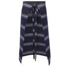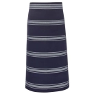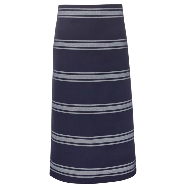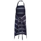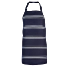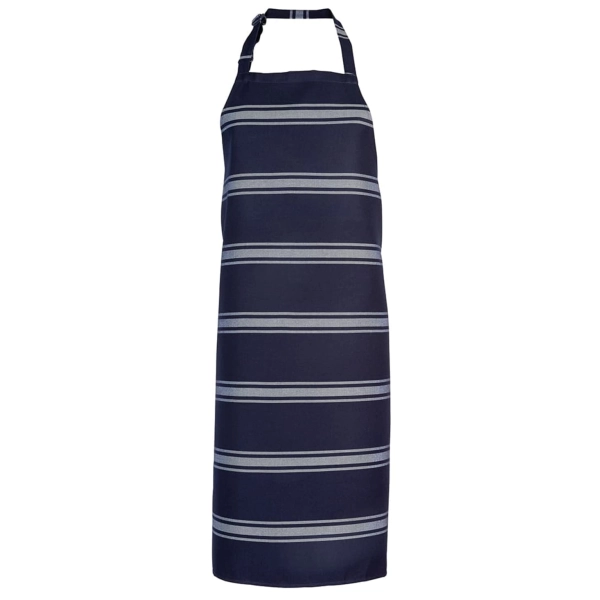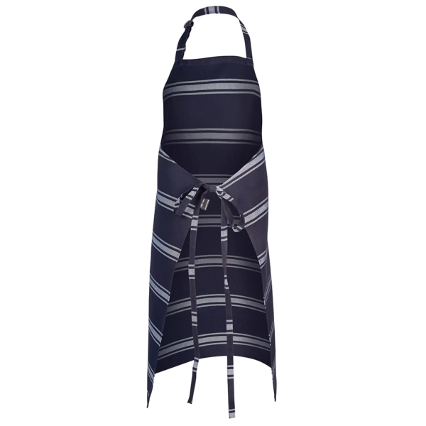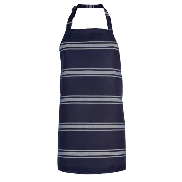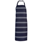 65% Polyester for durability, and 35% Viscose | Yarn-dyed twill weave stripe | Bib style, self fabric neck strap and side ties | Adjustable Bib neck strap with fixed on fasteners | Self-fabric ties | Easy care