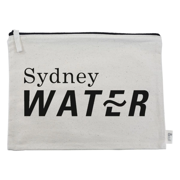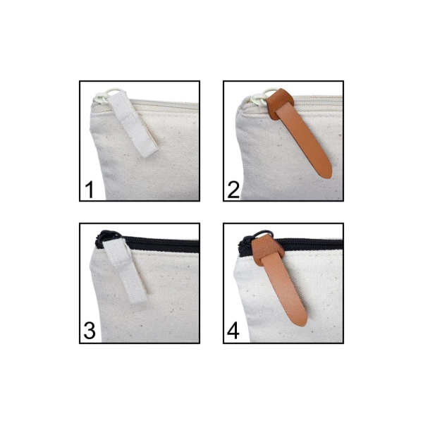 Options – select either: (1) natural or black coloured zip, (2) natural cotton zip puller or leatherette zip puller, (3) cotton handle, (4) debossed logo onto the leatherette badge or screen printed directly onto the calico material (additional charges apply for some of these options – see below).