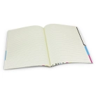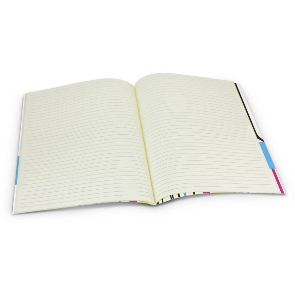 Fully customised A4 size notebook with saddle stitch binding and 32 leaves (64 pages) of 70gsm cream paper which is available lined or unlined. Individual pages can be customised in one colour or full colour for an additional cost. The notebook has a 250gsm cardboard cover which can be branded with stunning edge-to-edge full colour print on the front and back. An optional paper belly band is available and can be branded in full colour. A production lead time of 35 working days applies to this product by air freight and larger orders can be sea freighted on request to reduce the freight cost.