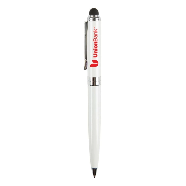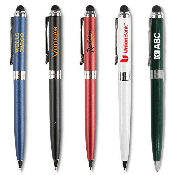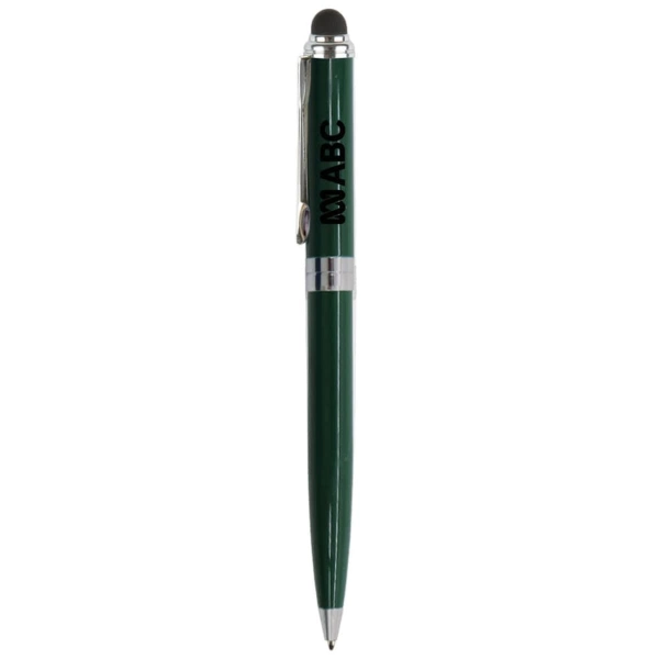 The Canterbury Stylus pen is an elegant brass twist action pen with silver accents and a stylus. Add a touch of elegance to your company’s promotional event by featuring this fantastic marketing tool. The stylus works on all touch screen devices; such as smart phones, tablets and iPhones. This product includes black ink.