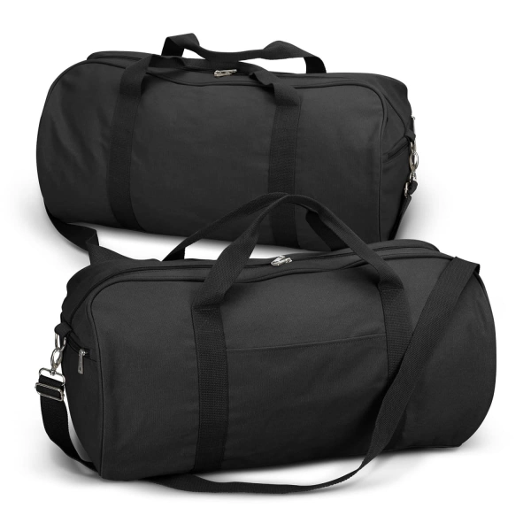 Modern 33L roll duffle bag manufactured from 450gsm heavy cotton canvas. It has webbing carry handles, a padded woven shoulder strap that is removable, and an external side pocket making it the perfect weekend getaway bag.