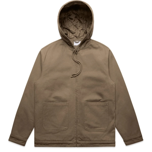 Showcasing the AS Colour Canvas Heavy Hooded Jacket, crafted with heavy weight cotton duck canvas and a quilted recycled polyester lining. Features include a lined hood, adjustable cuffs and hem, YKK zip closure, and convenient patch pockets. Designed with an invisible zip for effortless branding.
