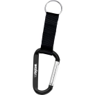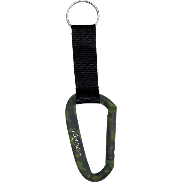 8mm carabiner. Woven nylon strap. Metal split key ring. Laser engraving recommended. Not intended for climbing. Engraves white.