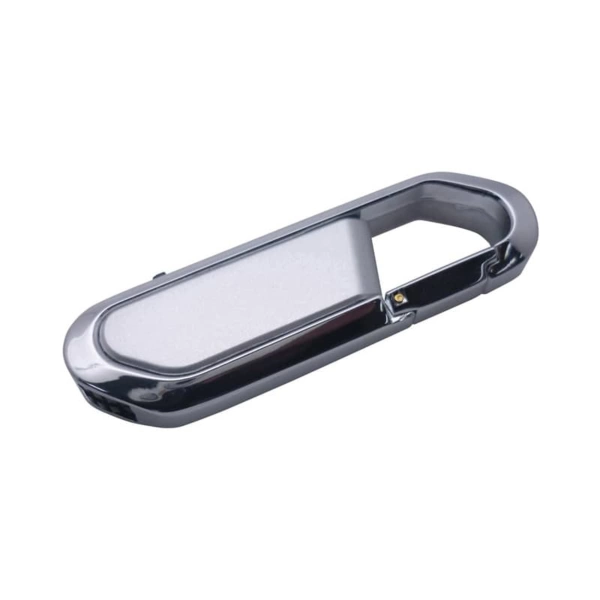 Carabiner flash drive with contrasting chrome trim, Grade A memory, 10 Year warranty on data retention, 1 year replacement warranty on faulty manufacture.