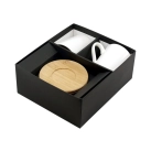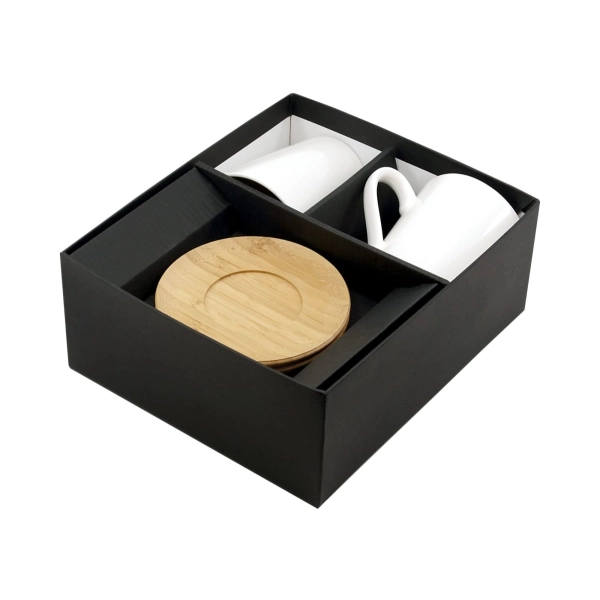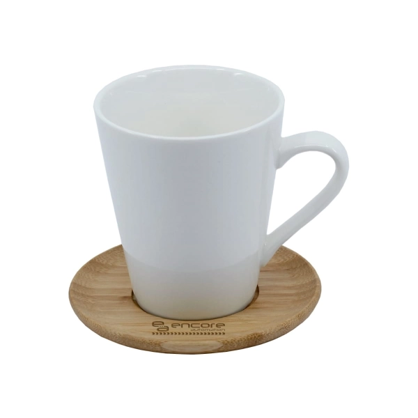 This gift-set contains 2 Carmel Vee mugs and saucers and is supplied packed in a sturdy gift box with cleat lid. The classic ‘V’ shape of this quality ceramic mug, combined with the natural look of the bamboo saucer makes this a truly unique gift. The saucer, featuring your logo, is crafted from environmentally friendly bamboo and adds to the overall look and feel of this product. Because of the unique nature of bamboo, the product and engraving colour may vary from item to item. As this product is hand crafted, the saucer may differ slightly in shape and size across the order.