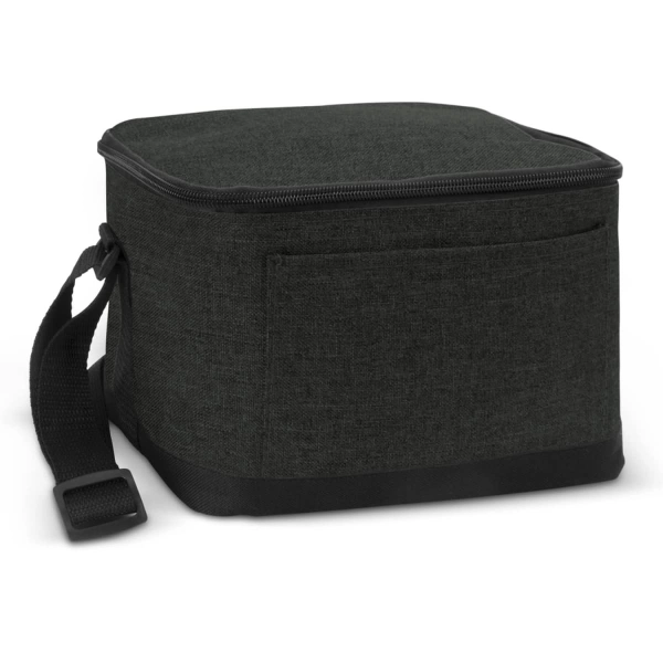 Small 4L cooler bag with PE foam insulation encased in a water-resistant PEVA inner liner. The outer construction is poly-canvas with an on-trend heather style finish. It has a zippered top closure, a slip pocket on the front and an adjustable woven shoulder strap.