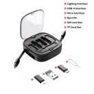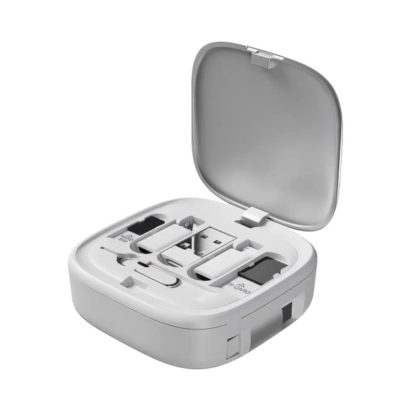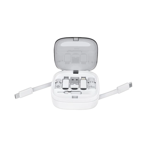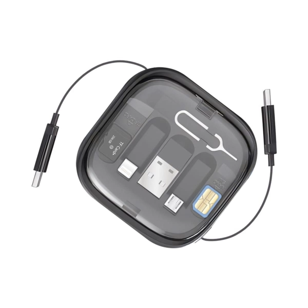 Minimise travel accessories with the Catania cable set and say goodbye to tangled cables. This high-quality 60-watt Type-C retractable flat cable offers high-speed charging and data transfer options and conveniently retracts into a compact, lightweight travel case. It comes with a comprehensive set of adaptors (including Type-C to Lightning, Type-C to Micro, and USB to Type-C) as well as a SIM card extraction tool, SIM storage, Nano SIM storage slots, and a slide-out phone stand. It's compatible with Apple CarPlay, Android Auto, and most portable devices, including smartphones and laptops. Material: ABS, TPE.